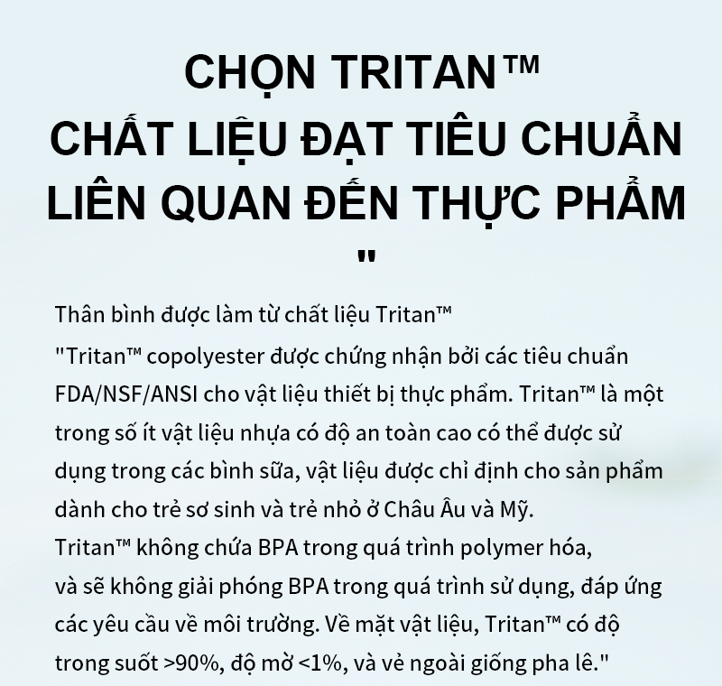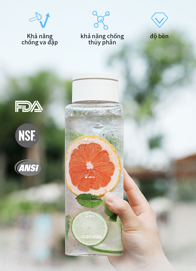 ✔️ Chất liệu Tritan an toàn: Không BPA, chứng nhận FDA/NSF/ANSI, chịu nhiệt và chống va đập.