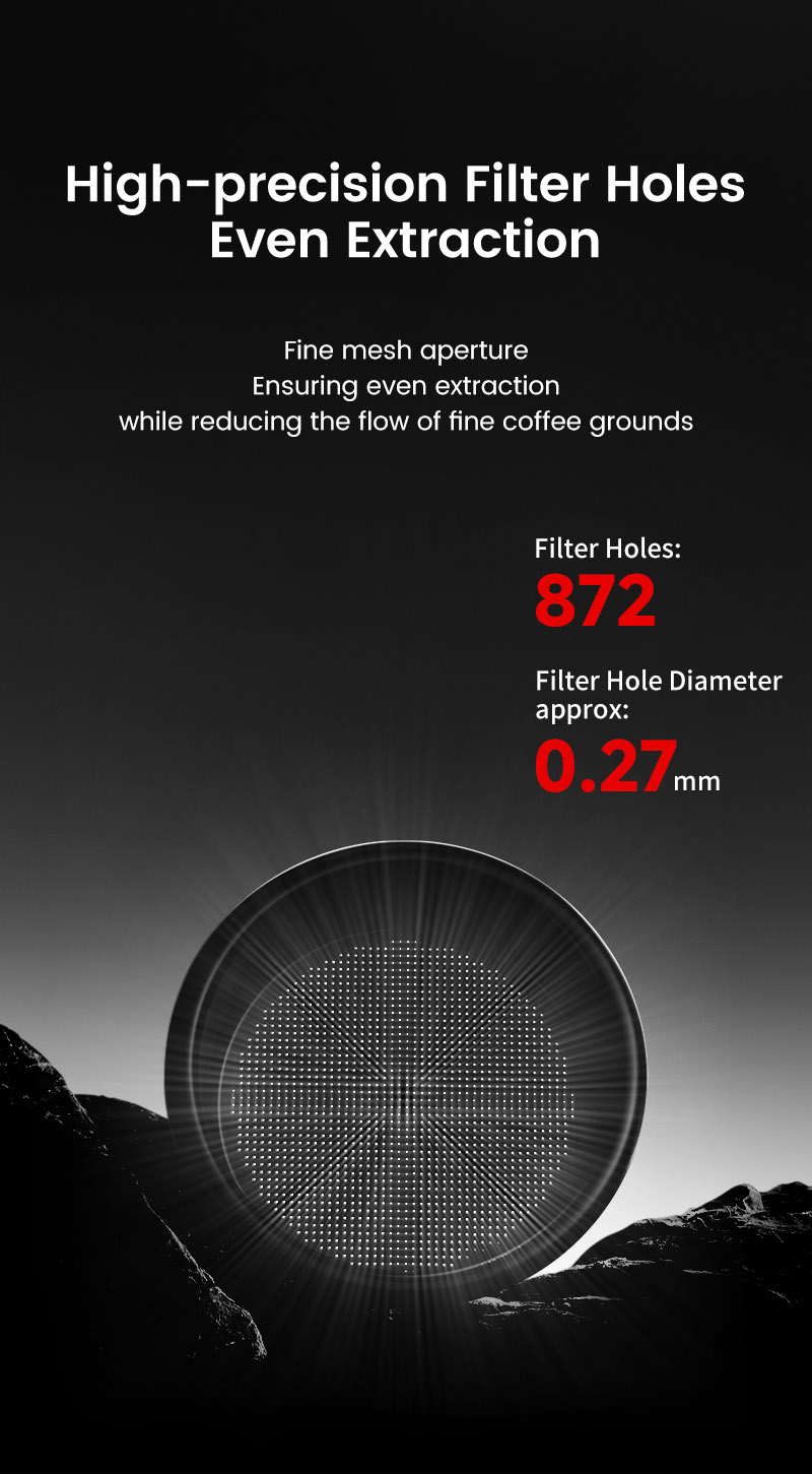 ✔️ 872 lỗ lọc siêu mịn 0.27mm: Phân bố đều, giúp chiết xuất đồng đều, tăng độ ngọt và crema dày mịn.